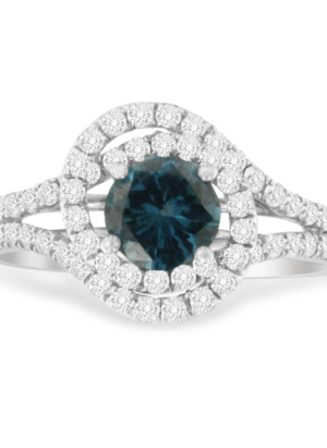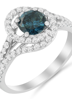 14K White Gold 1-1/3 Cttw White & Blue Diamond Interweaving Double Halo Cocktail Statement Ring (G-H and Fancy Blue Color, SI2-I1 Clarity)