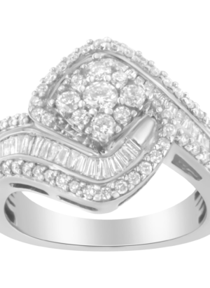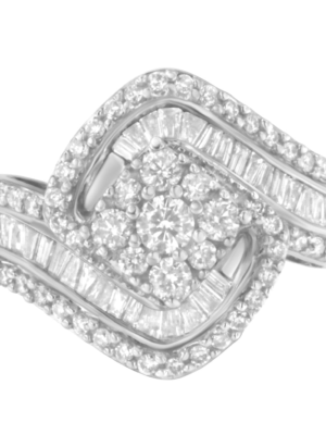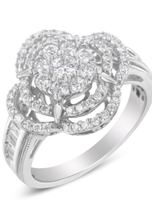 14K White Gold 1.0 Cttw Baguette & Brilliant-Cut Diamond Round Floral Cluster Engagement or Fashion Ring with Swirl Wrapped Triple Row Band (H-I Color, SI2-I1 Clarity)