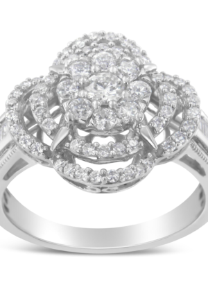 14K White Gold 1.0 Cttw Round & Baguette Cut Diamond Floral Cluster Quatrefoil Channel Set Band Cocktail Statement Ring (H-I Color, SI2-I1 Clarity)