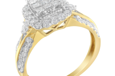 Elegant and timeless, this 10K yellow gold diamond engagement ring features 1.07 carat total weight of diamonds with a square cluster of nine princess cut diamonds with a milgrain border haloed by round-brilliant diamonds arranged in a cushion shape. These stones sit atop a high cathedral style setting with an open gallery featuring a V shape. The gallery connects on both sides to a tri split shank each decorated with diamonds. The back of the flat style band has a high shine, polished finish. The ring features 55 diamonds in all. This authentic design is crafted of real 10K yellow gold, ensuring it will keep a tarnish-free shine for years to come. This ring makes a great engagement ring, anniversary ring, promise ring, or statement ring. Diamonds are thought to give the wearer clarity and illuminate solutions to life?EUR(TM)s problems, as well as encouraging abundance, strength, harmony, and commitment. Give her a gift that will last forever.