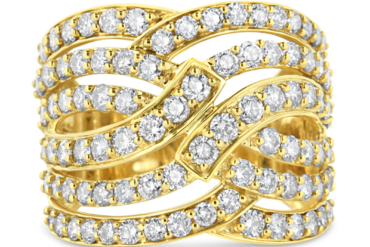 This chunky band ring proves that bigger is always better. Starting from the base which is a 10K gold band, the multi-row wave pattern is definitely its main charm, but we?EUR(TM)re taking it to the next level by fully embellishing it with diamonds. The 94 round, prong-set natural diamonds total up to 3.0 cttw, and they shine like no other. The breathtaking piece will make the perfect gift to your other half regardless of the occasion.