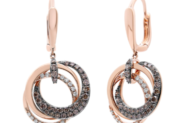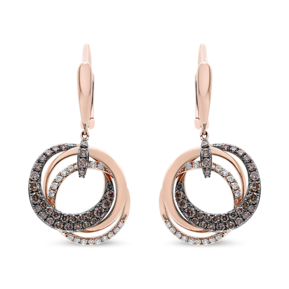 Designed in a contemporary style are the stunning triple circle diamond earrings in 14k rose gold. Each piece seamless symphony of three hoops coming together like a spectacular magic show. One hoop features resplendent rose gold, another hoop features sparkling white diamonds, and the final hoop features decadently brown diamonds accented with jet black rhodium. All 3 hoops dangle from a rose gold and black rhodium diamond encrusted bale. Earrings come with lever backs for a secure and comfortable fit.