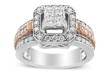 This intricately designed cocktail ring has a composite design that shines with 1 1/8 cttw of natural diamonds. A cluster of 4 princess-cut diamonds sits at the center of this piece, and is flanked by a separated halo of round-cut diamonds. The 14k white gold band has a streak of rose-gold going through the center. Round-cut diamonds embellish the band as well for an extra dazzling effect. This cluster ring will look magnificent on your fingers.
