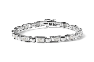 Add some glitter to your growing jewelry collection with this beautiful 14k white gold tennis bracelet. This piece is designed with gold rectangular links, each adorning 8 natural, princess-cut diamonds in an elegant channel setting. The total carat weight of this bracelet is 1.00 cttw, making it the perfect piece to pair with any formal outfit. This piece has a box clasp for a safe and secure fit.