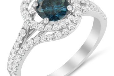 Elegant and timeless, this gorgeous 14K white gold blue and white diamond cocktail ring features 1.34 carat total weight of diamonds with a whopping 67 individual stones. The fashion ring features a large round, brilliant cut fancy heat treated blue diamond centered within two interwoven teardrop shaped half halos of petite white diamonds that surround the center stone and wrap around to form the tapered split shank. This classic, feminine spiral themed cocktail ring makes a great gift for any special occasion! Whether worn for daytime glamour or evening sparkle, this cocktail ring is gorgeously versatile. It can act as an engagement ring and serve as the ?EURoesomething blue?EUR? that accompanies her down the aisle. Give her a gift that will perfectly complement her favorite ensemble.