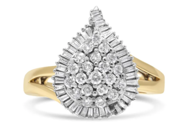 This stunning 14K yellow and white gold cocktail ring boasts an impressive cluster of 1 ct of diamonds. The central cluster of round-cut diamonds is flanked by baguette-cut diamonds along it’s side in a pear shaped design. The band is a gleaming yellow gold while the diamond cluster is set in white gold. This is the perfect accessory for any night out!