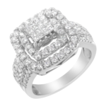 This diamond cocktail ring sparkles with a central square cluster of round diamonds surrounded by a double halo. The wide band is crafted in 14 karat white gold and has three rows of round diamonds. It has a total diamonds weight of 1 1/2 carats.