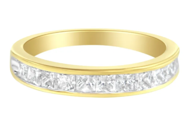 A classic half eternity band that is elegantly crafted with a row of princess cut diamonds channel set in 14 karat yellow gold. There are 11 total diamonds with a weight of 1 carat.