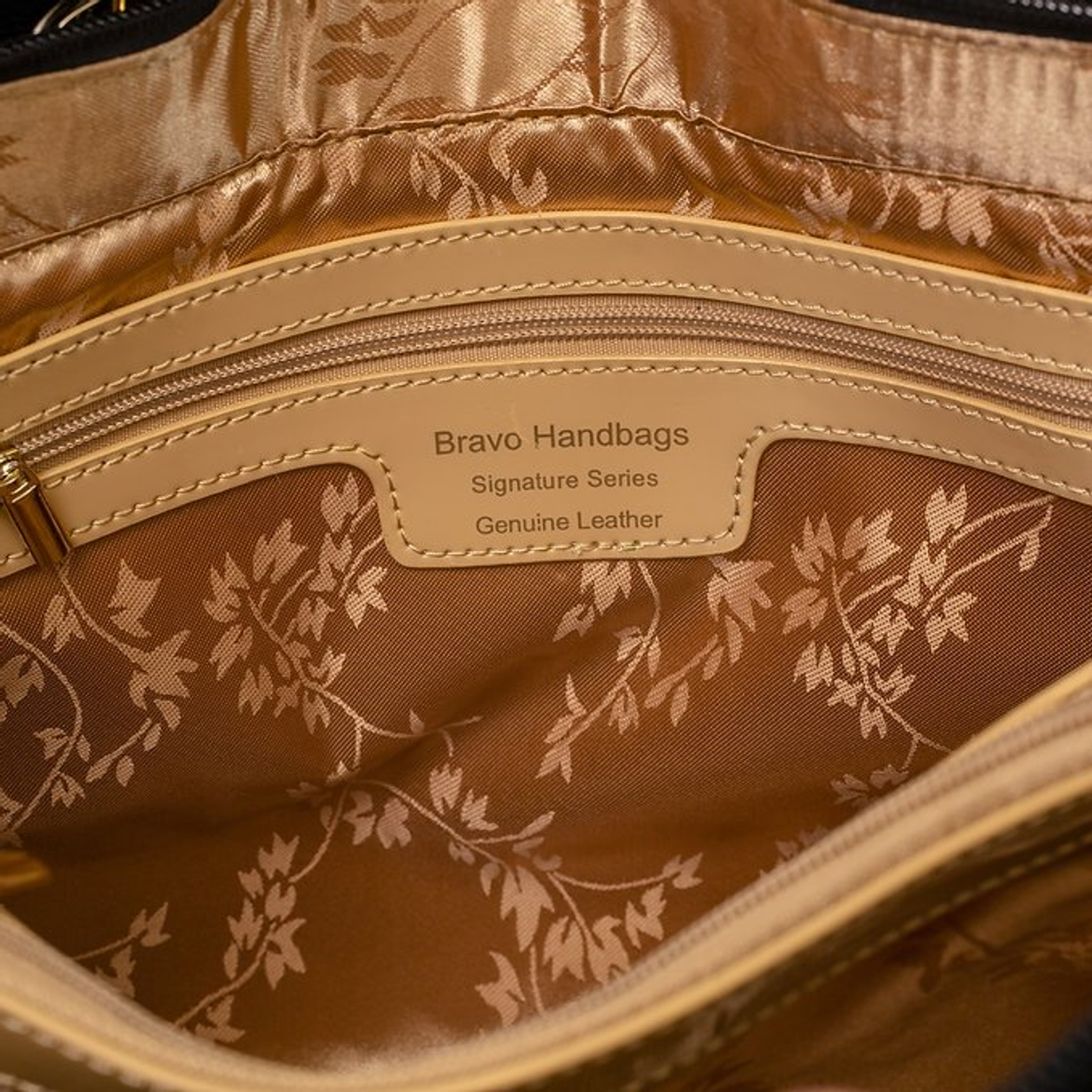Enamel Coated Italian Calfskin Leather Gold Leaf Embroidered Cotton Polyester Twill Lining Inner Zipper Middle Pocket 1 Inner Zipper Side Pocket, 2 Inner Side Pockets (For Cell/PDA) Outside Rear Zipper Pocket Nickel Plated Hardware Made in USA. All Bravo Bags/Wallets are coated with airplane paint a exclusive technology to Bravo to prevent scratches, cracking, peeling and are RFID proof.
