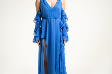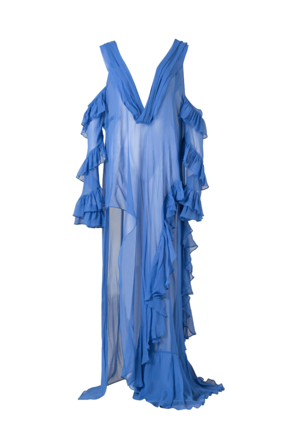 A long, flowing dress. The collar is designed with an open V-neckline which can be adjusted. It also features an invisible back zip closure. Short sleeves with elasticized flounce cuffs.