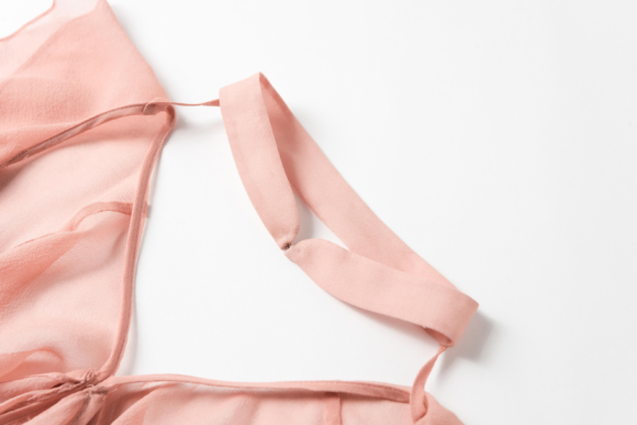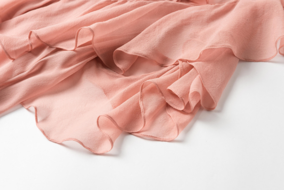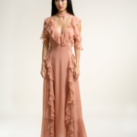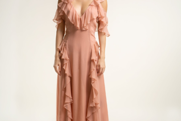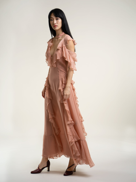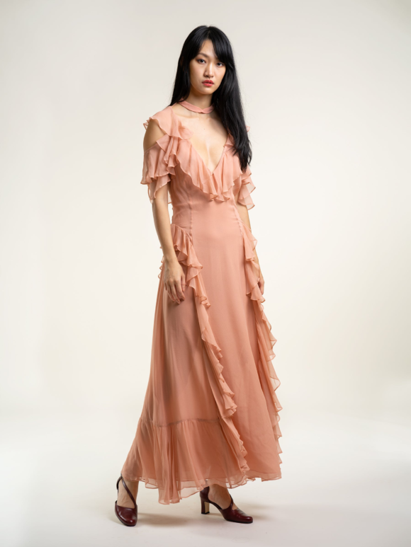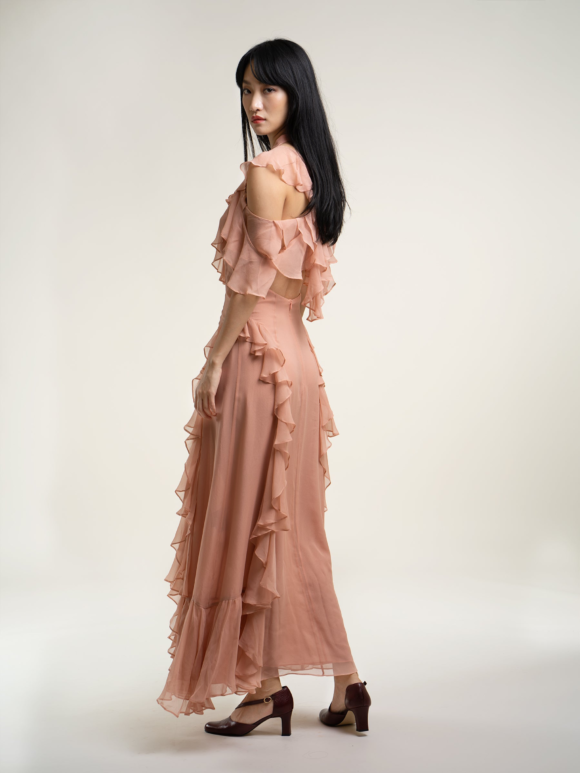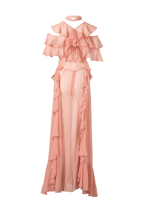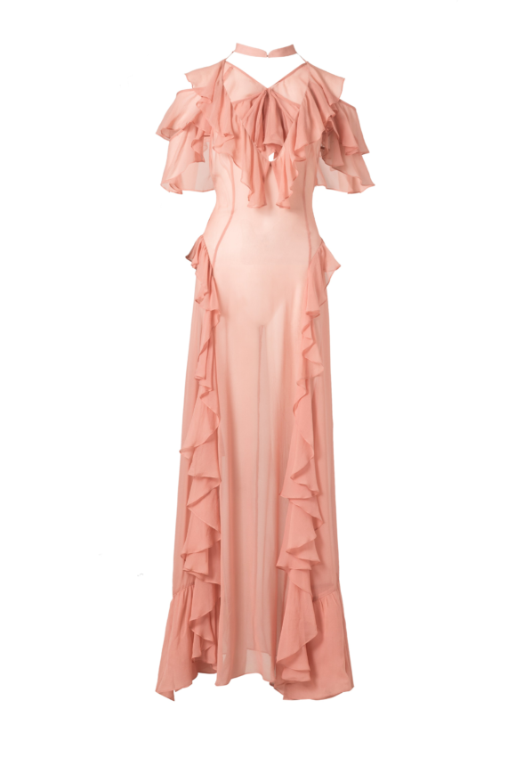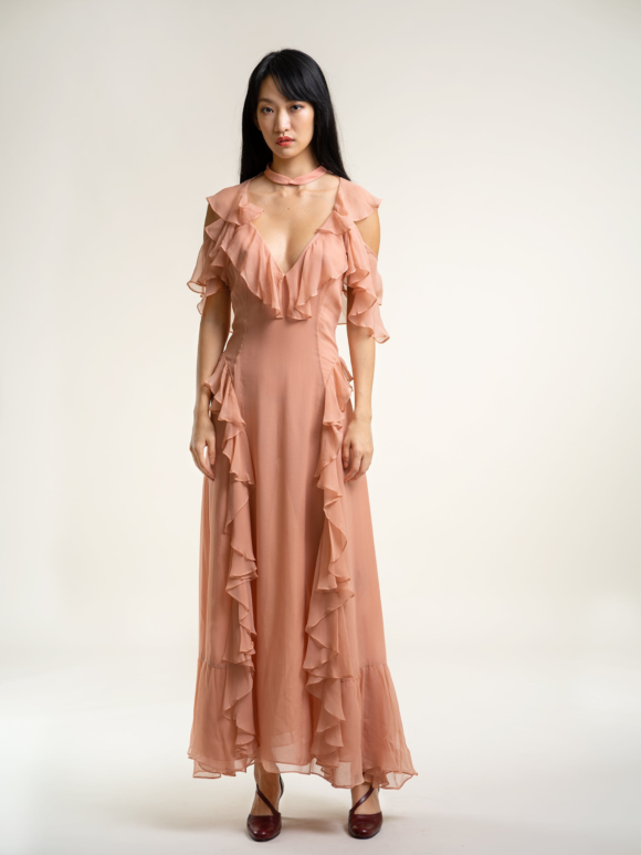 A long, flowing dress. The collar is designed with an open V-neckline which can be adjusted. It also features an invisible back zip closure. Short sleeves with elasticized flounce cuffs.